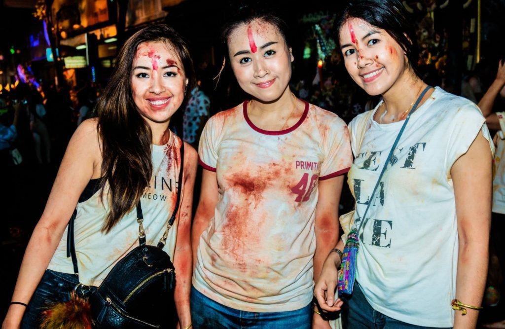 Three young woman enjoying Dussehra festival in Bangkok, Thailand