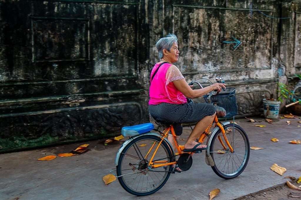 Age, just a number. An old Thai woman happily paddling away on her bicycle, Bangkok, Thailand.